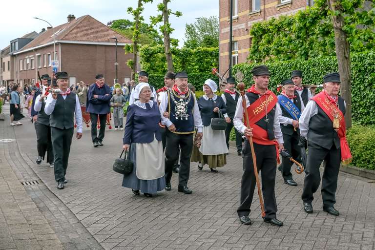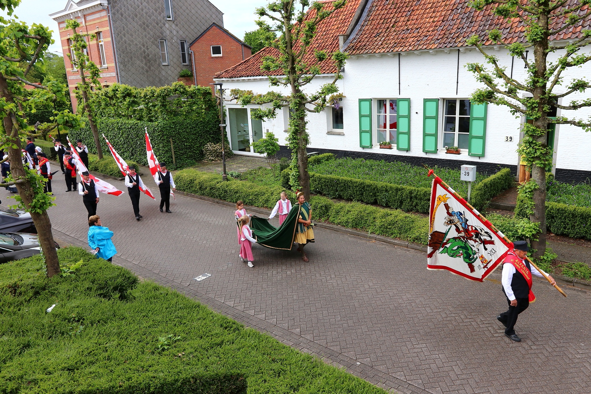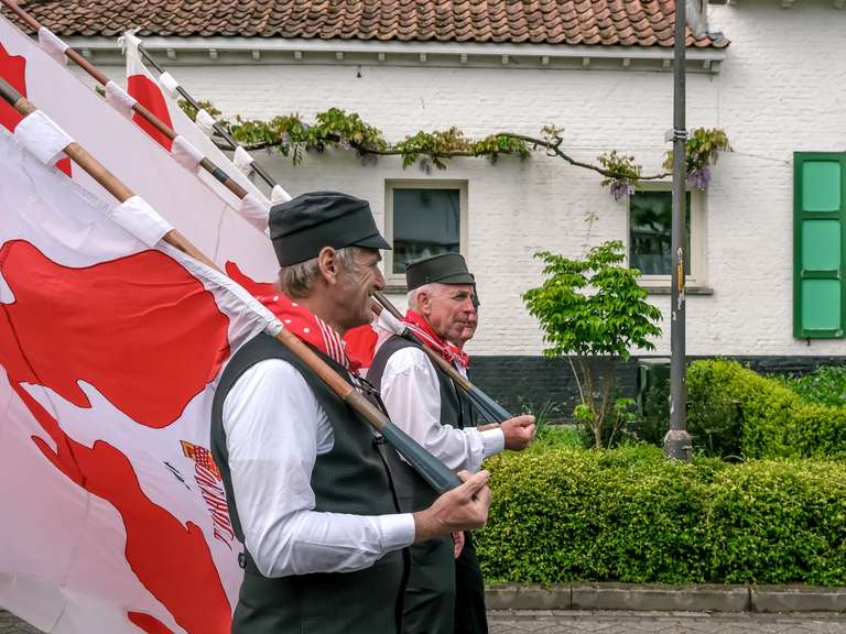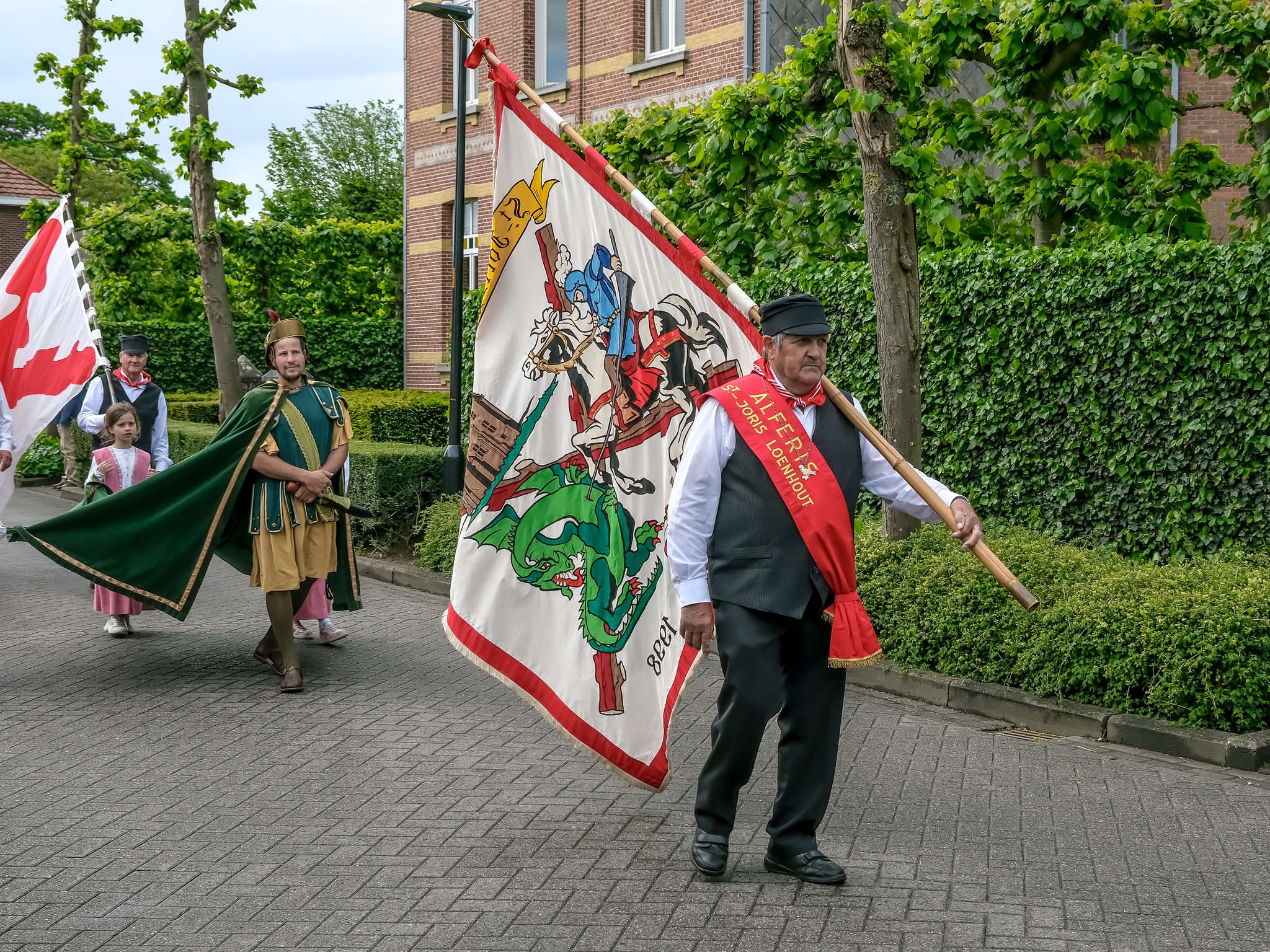 Leden van de gilde volgen hun patroonheilige met hun wapens en emblemen.