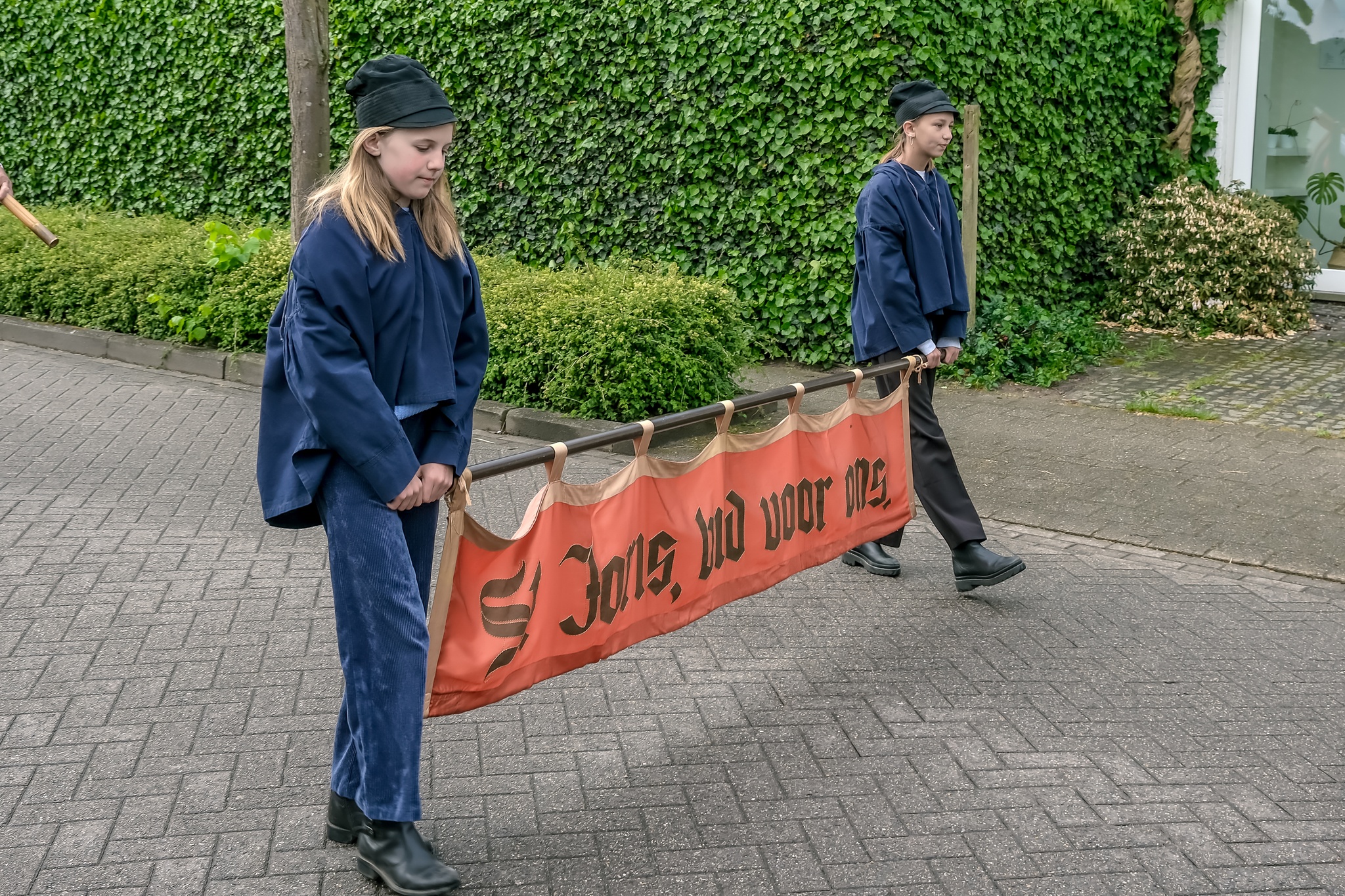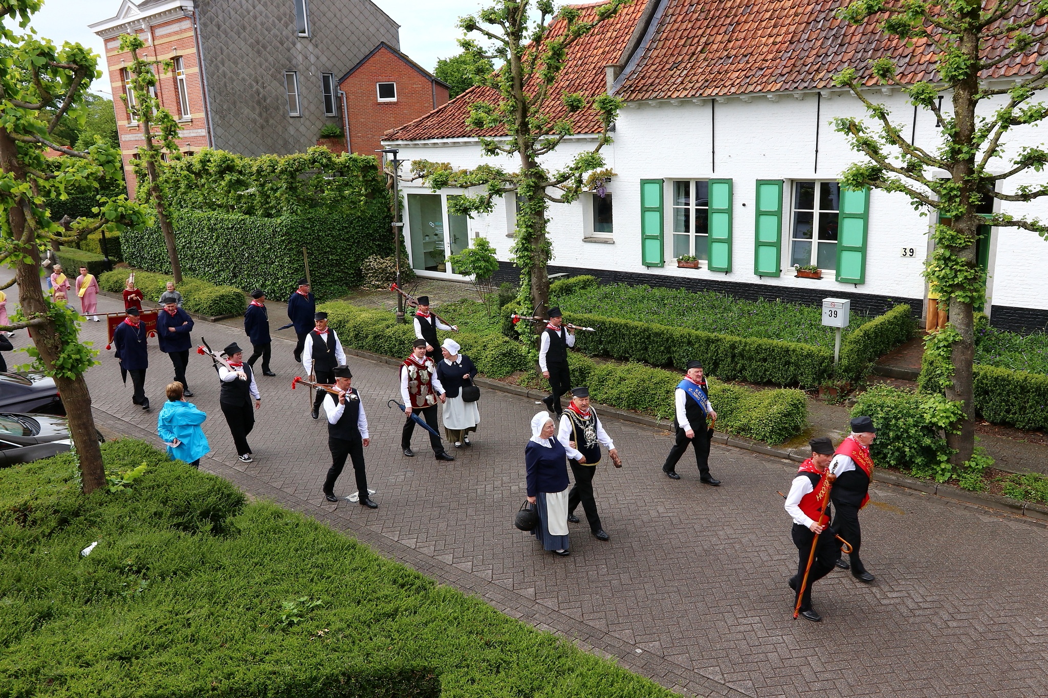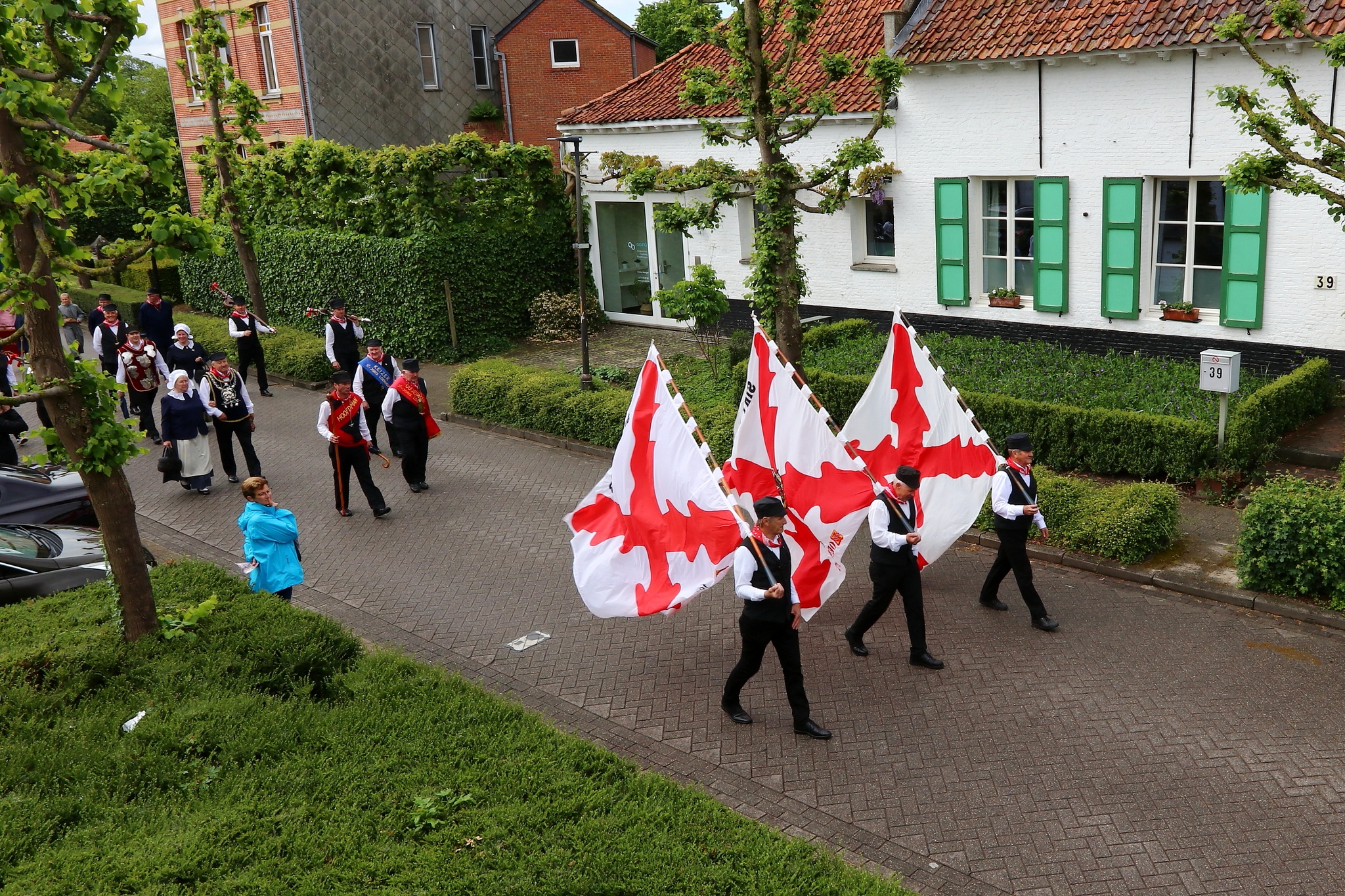 Leden van de gilde volgen hun patroonheilige met hun wapens en emblemen.