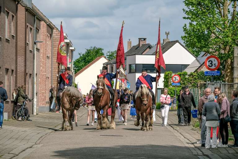 Op deze drie paarden zitten drie vertegenwoordigers van de gilden; ze voeren de wimpel van hun gilde.